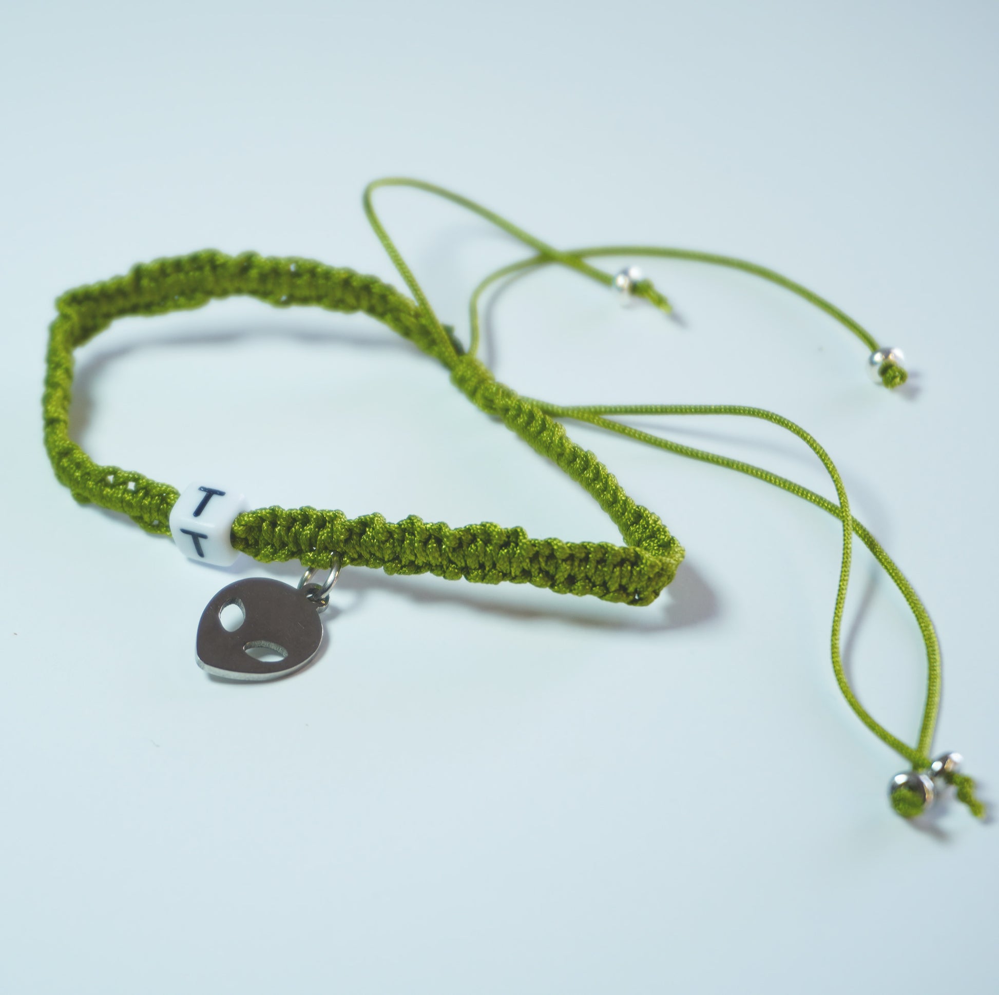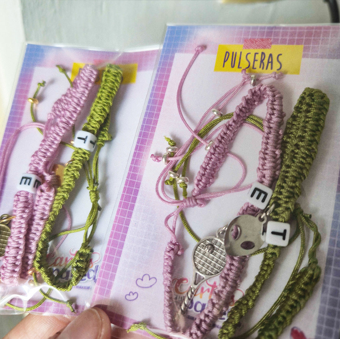 Pulseras tejidas a mano con dije E + Raqueta de tenis y T + Alien.
